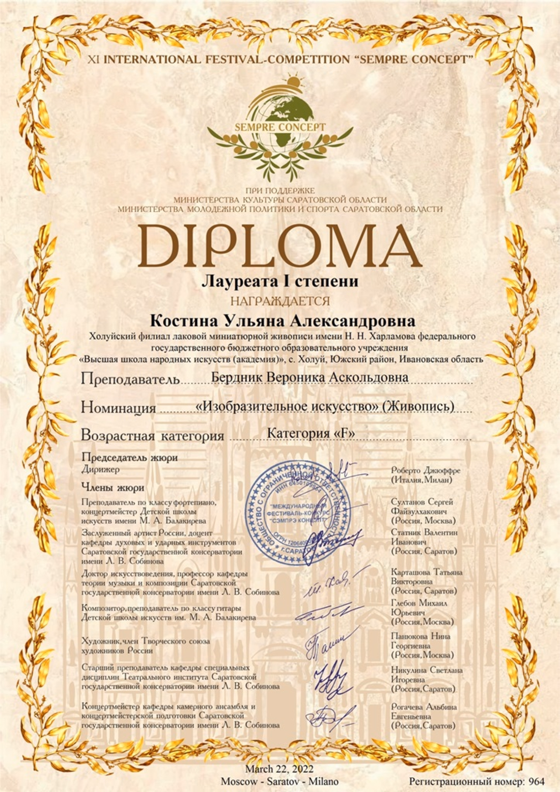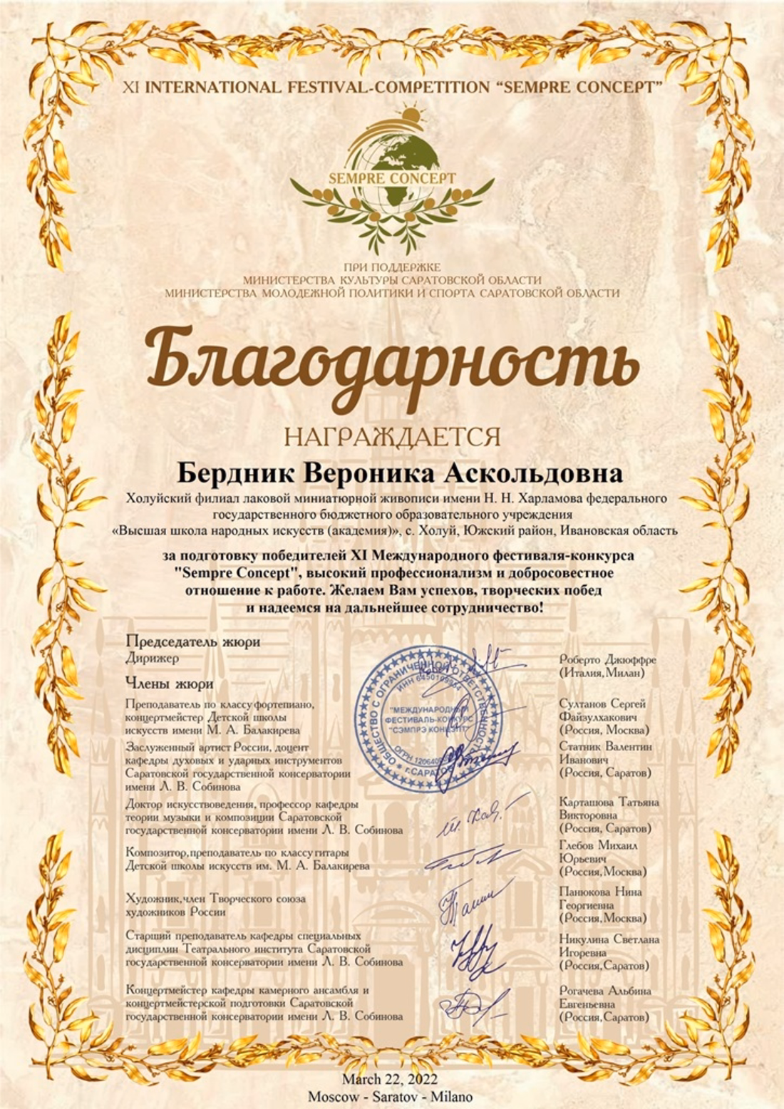 В Марте 2022г. при поддержке Министерства культуры и министерства молодёжной политики и спорта Саратовской области проходил XI Международный фестиваль-конкурс "Sempre Сoncept". По итогам конкурса студенты 2 курса СПО (ЛМЖ) стали победителями в двух возрастных категориях: Мольков Родион Александрович - Лауреат I степени (возраст. кат. E) Костина Ульяна Александровна - Лауреат I степени (возраст. кат. F). Благодарность за подготовку победителей, грамотную и высокопрофессиональную работу получил преподаватель Рисунка и Живописи БЕРДНИК ВЕРОНИКА АСКОЛЬДОВНА.